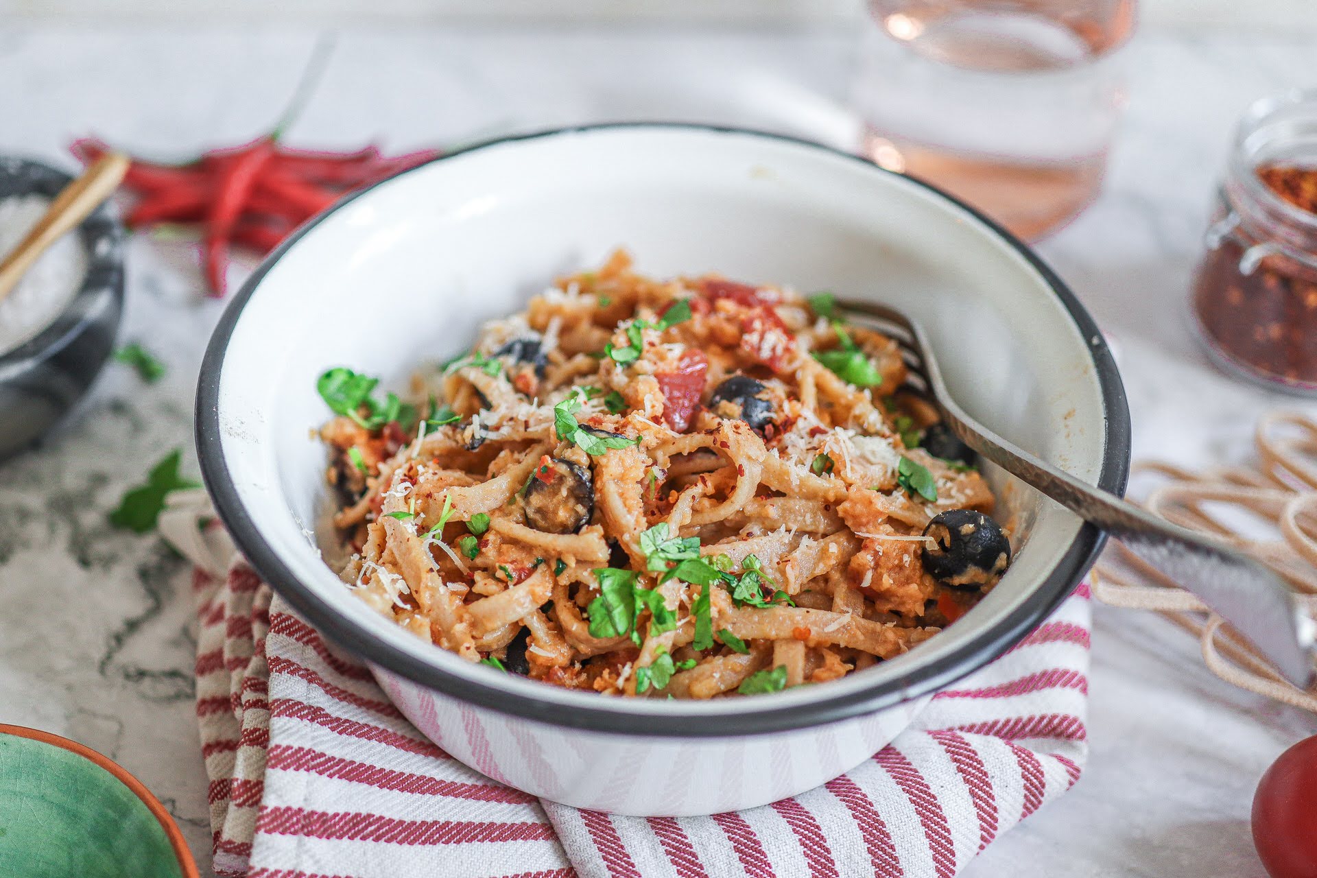 Schritt 7: Die Pasta auf zwei Schüsseln verteilen und mit gerösteten Semmelbröseln, frischer Petersilie und Parmesan bestreuen und servieren. Wer noch extra Schärfe mag, streut sich noch mehr Peperoncino über das Gericht.